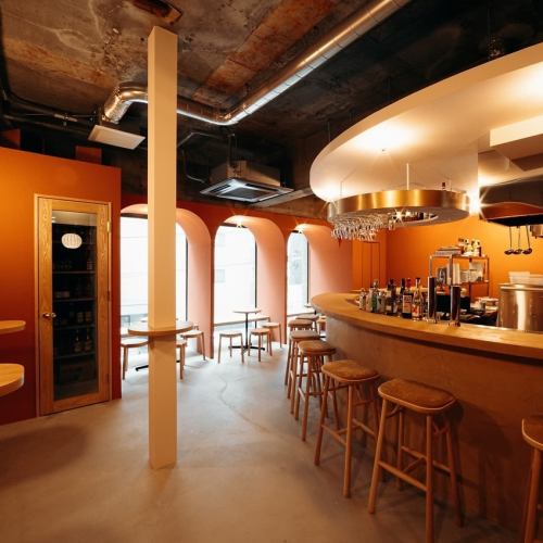 お客様同士も話しやすい賑やかな空間となっております。カップルでの利用も◎ピンクとオレンジの壁と丸みを意識した柔らかな印象の内装がオシャレな店内には、カウンター13席・テーブル6卓18席をご用意しております。